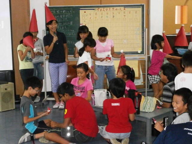 みんなでお弁当を食べた後は、おまちかねのクリスマス集会!環境文化委員さんたちがサンタ帽で登場です。