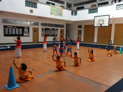 JSCフェスティバル本番用の衣装を着て初めて踊ります。キャンディアンダンスにとって衣装はとても大切なもので、誰でもが着ることができるものではないそうです。そんな大切な衣装に、ブディ先生に着方を教えていただきながら着替えました。
