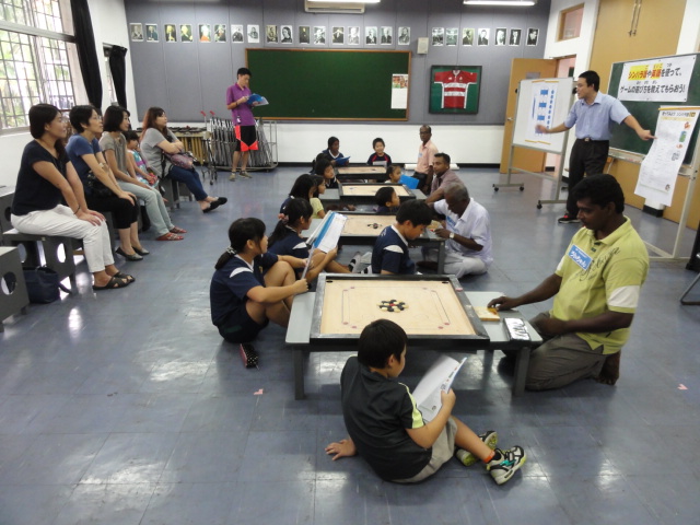 ◆キャロムボードの遊び方をローカルスタッフさんから教えてもらいます。