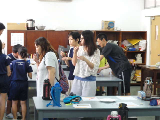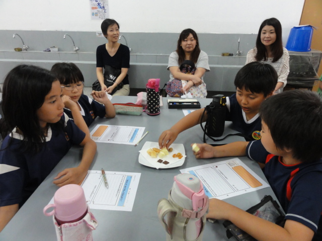 第5回 授業研究会 第5回授業研究会 「おいしさをくわしく伝えよう!」 やっぱり、食べ物の魅力はすごいです。 みんな、都丸先生が何を食べたか興味津々のスタートです。 「おいしさ」をくわしく伝える言葉をみんなで出し合い、 最後にマンゴスチンの味を表現しました。