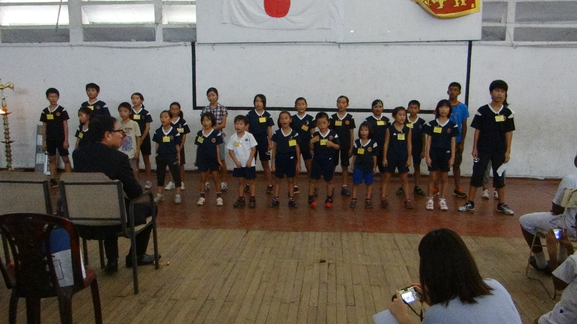 日本人学校の子ども達は、 カントリーロードのハンドベル演奏を取り入れた合唱とニルアハス タレの2曲を披露しました。 6年生の佐藤汰一君がシンハラ語で歌の説明を行いました。