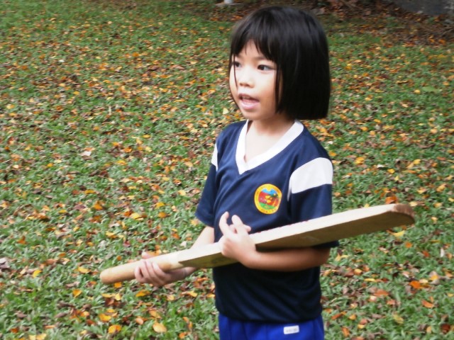 なるほど。ルールがわかったところで早速ボールを打ってみることにしました。学校にこんなにたくさんクリケットのバットがあったのですね!さて、いざ打つとなるとこれがなかなか当たらない!でもワタル君はさすがに経験者だけあってフォームがきれいです。